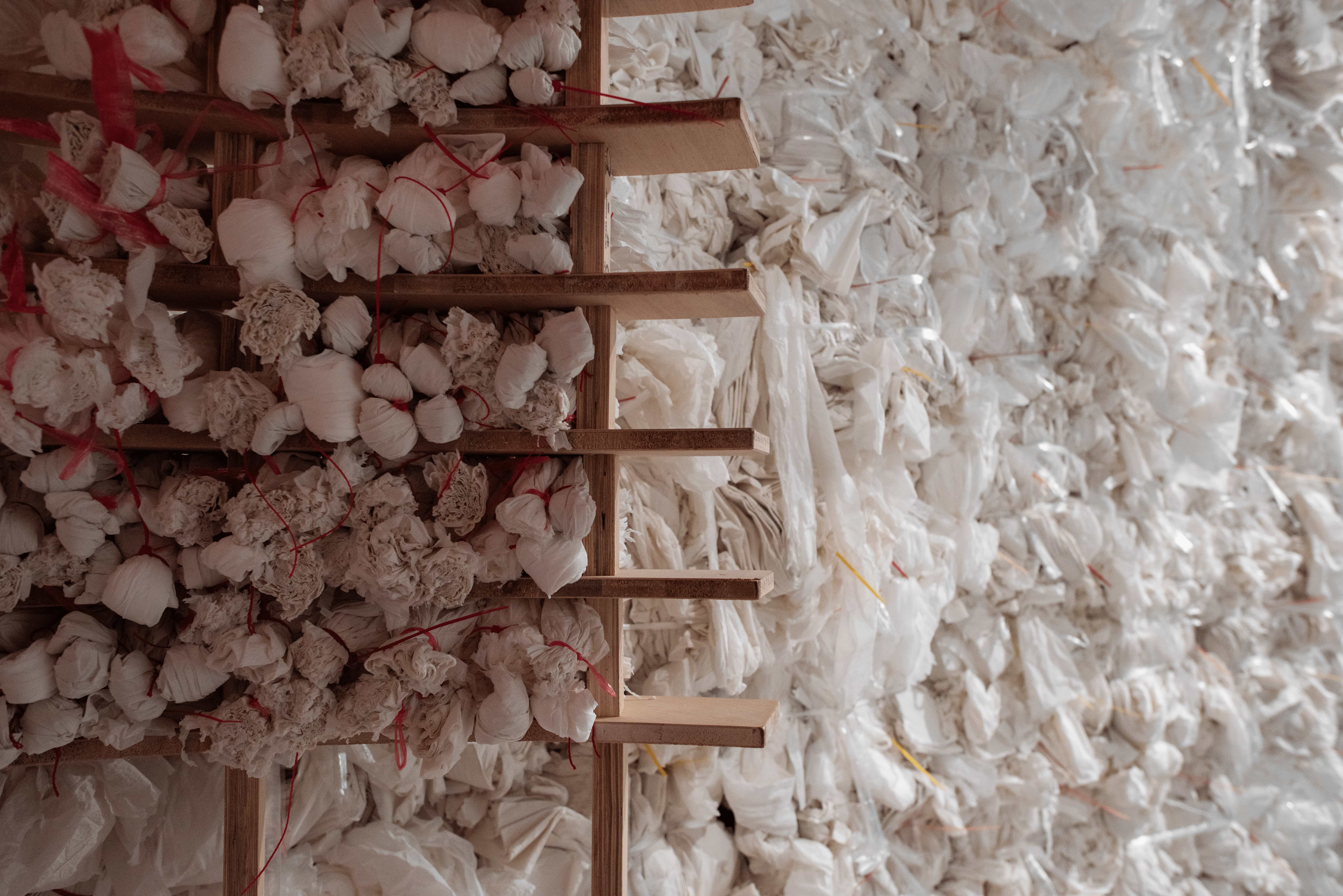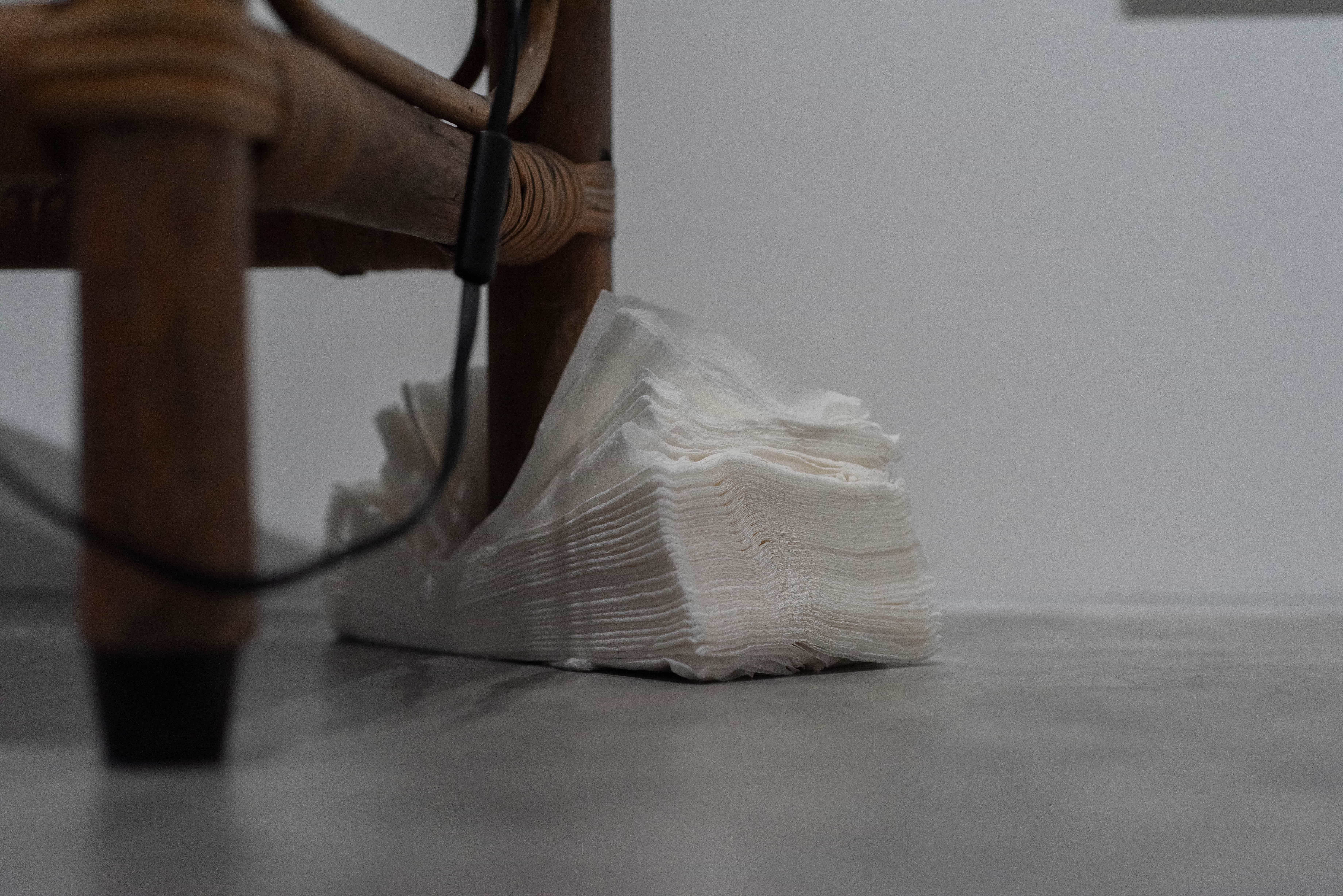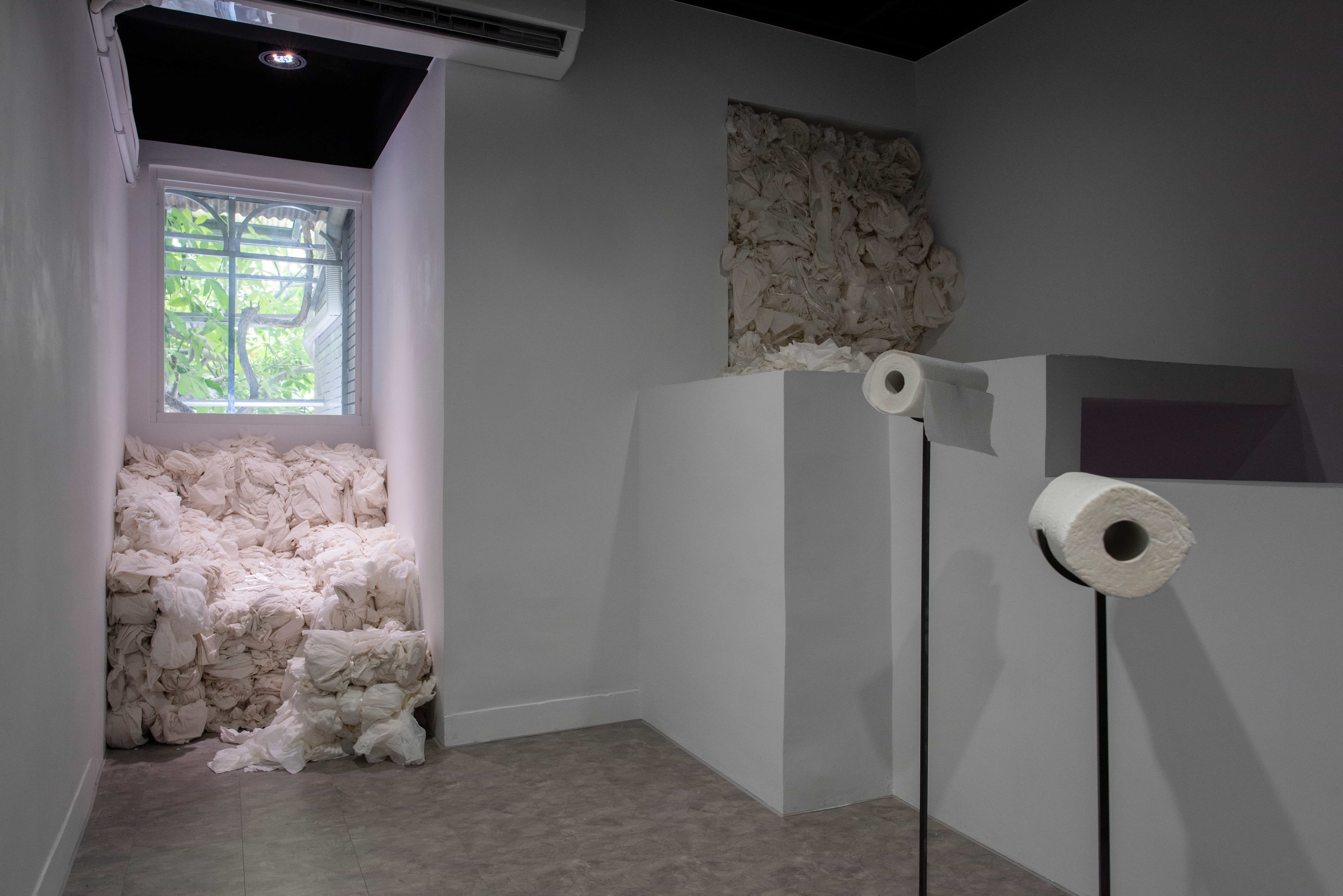 父親離世後,衛生紙在藝術家的生活中悄然轉化為承載記憶的媒介。架子下、櫃子裡、閣樓與倉庫間,大量堆疊的衛生紙成了他與往事最直接的連結。他以衛生紙為材料,結繩、揉捏、堆疊,使其在反覆的手勢中形成龐大的形體。然而在鼻子過敏的瞬間,紙張仍回到它最原初的用途——