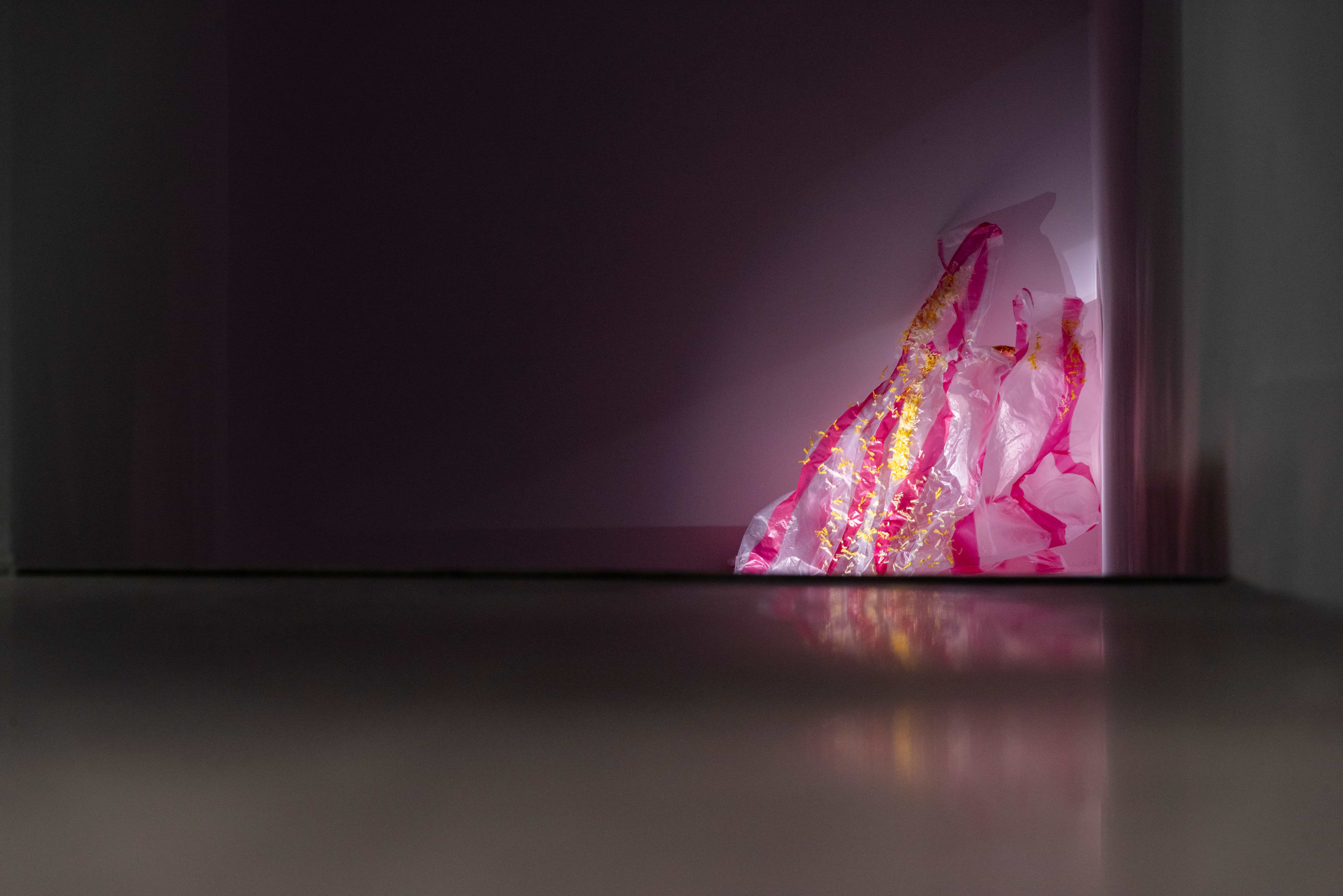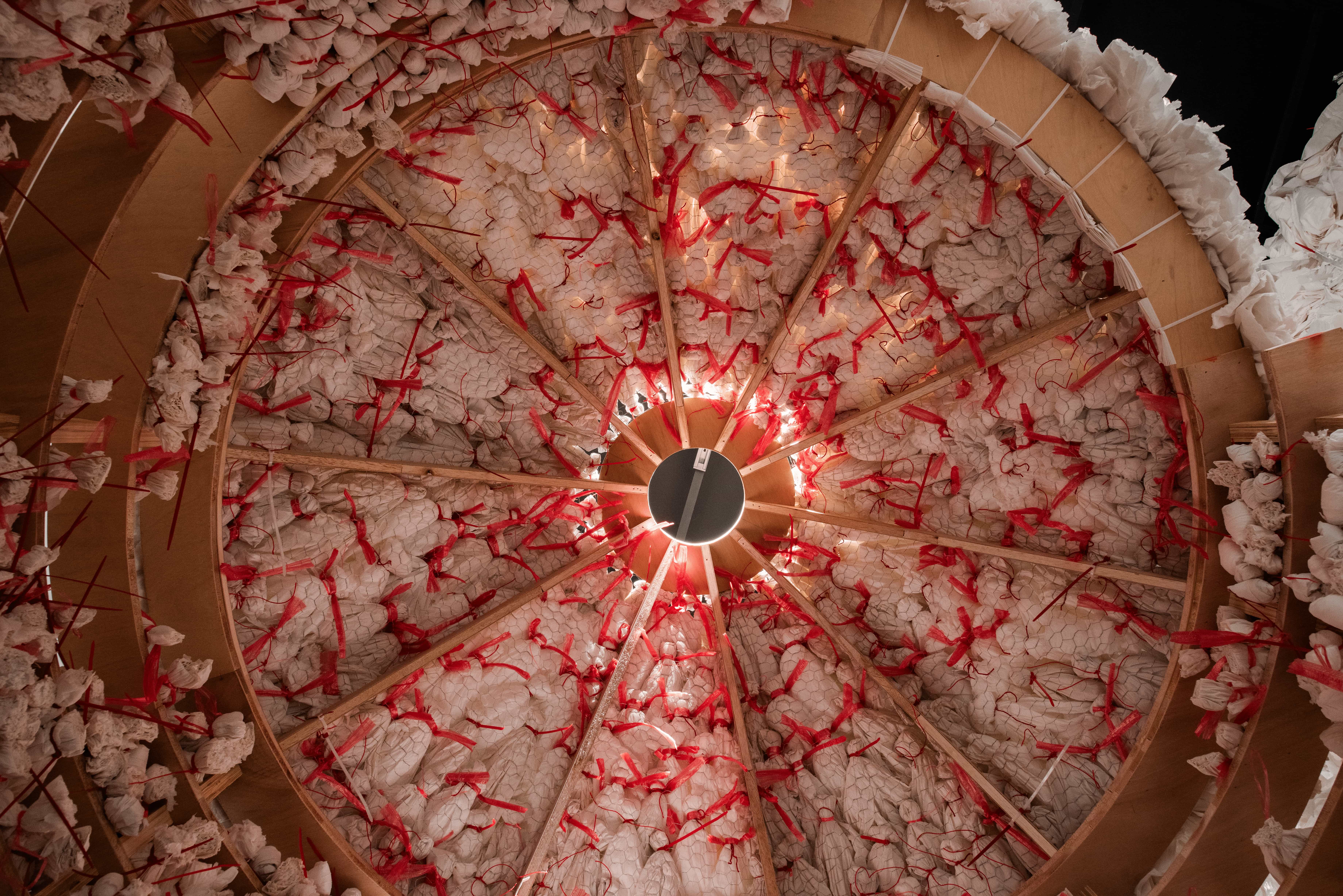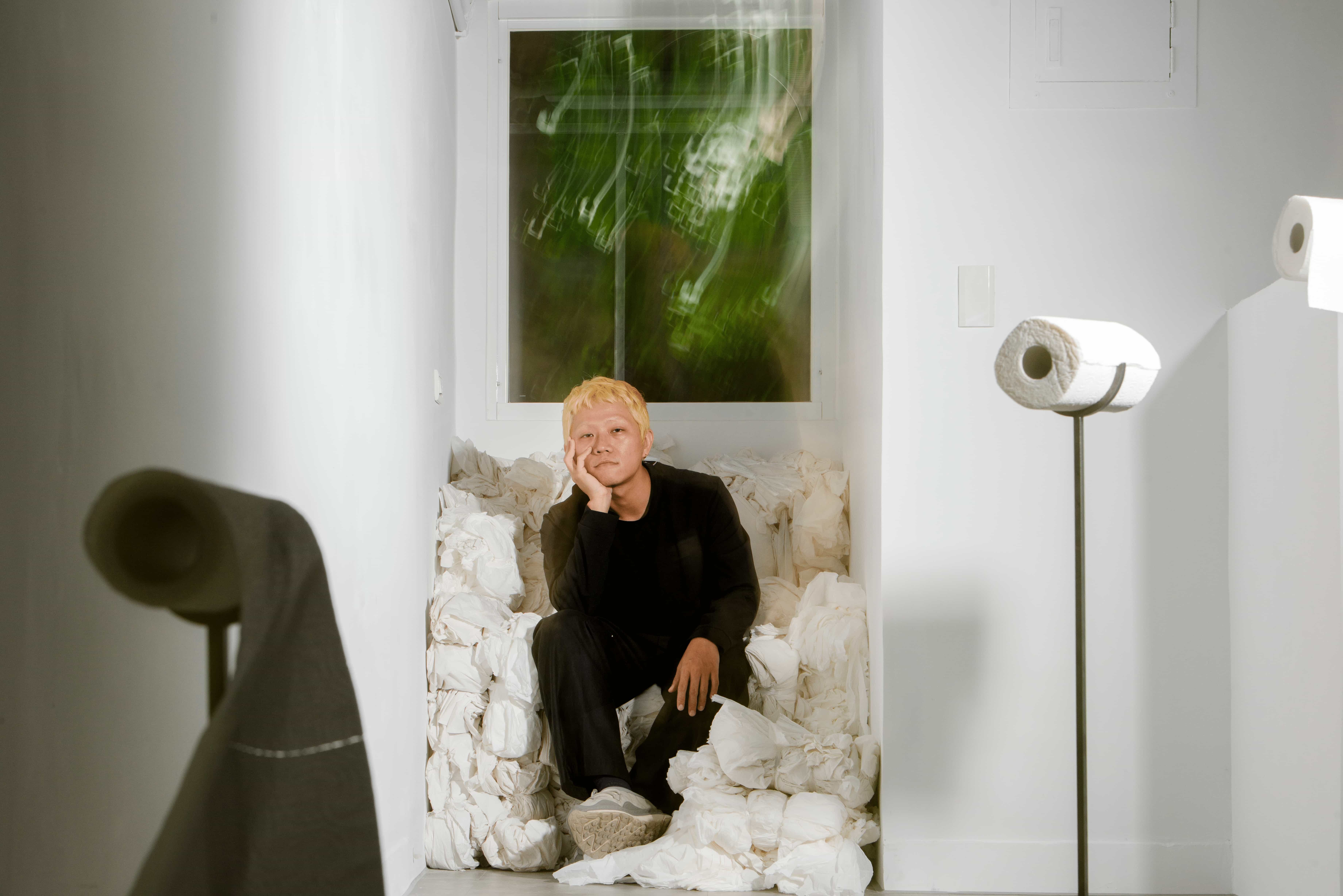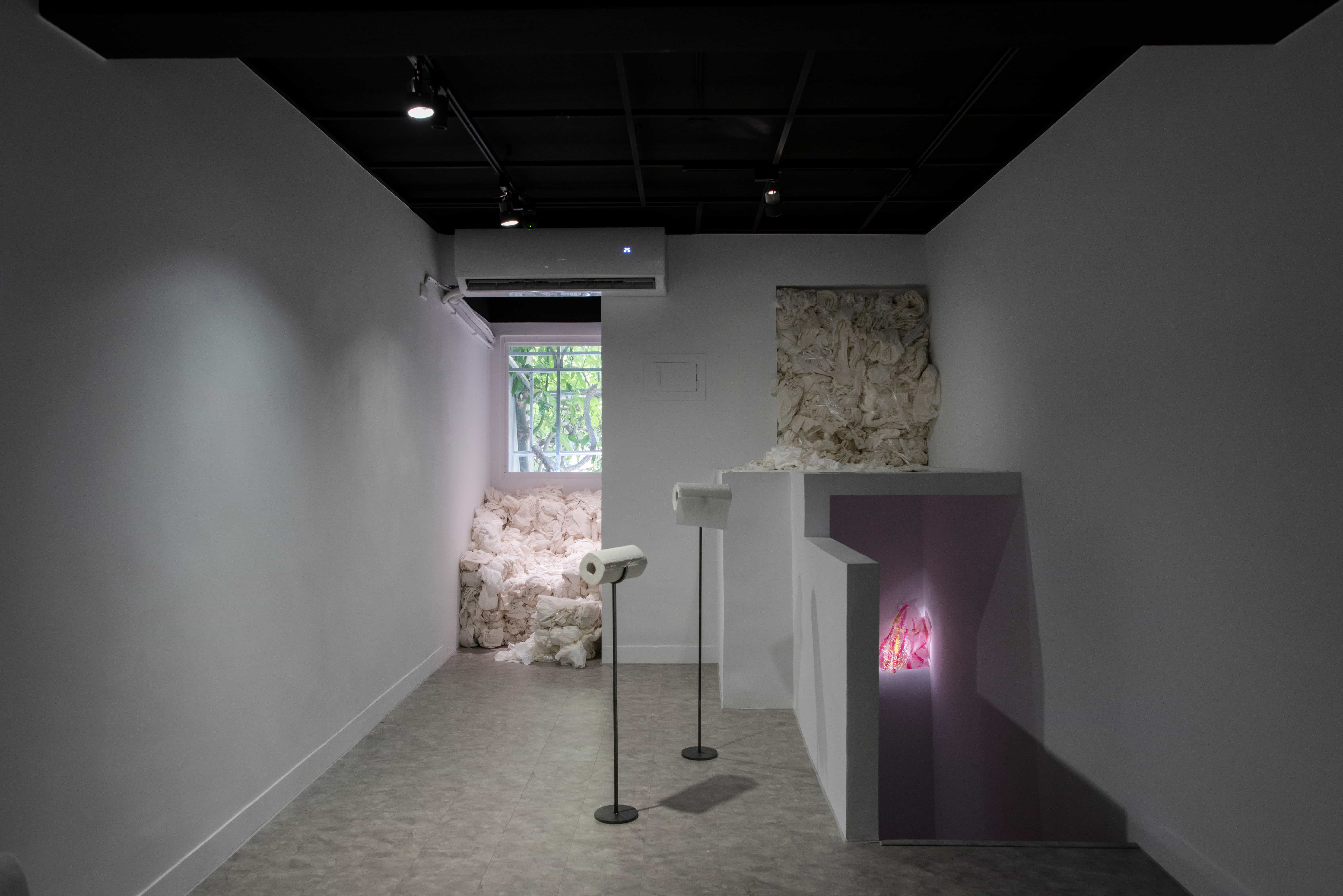 父親離世後,衛生紙在藝術家的生活中悄然轉化為承載記憶的媒介。架子下、櫃子裡、閣樓與倉庫間,大量堆疊的衛生紙成了他與往事最直接的連結。他以衛生紙為材料,結繩、揉捏、堆疊,使其在反覆的手勢中形成龐大的形體。然而在鼻子過敏的瞬間,紙張仍回到它最原初的用途——
