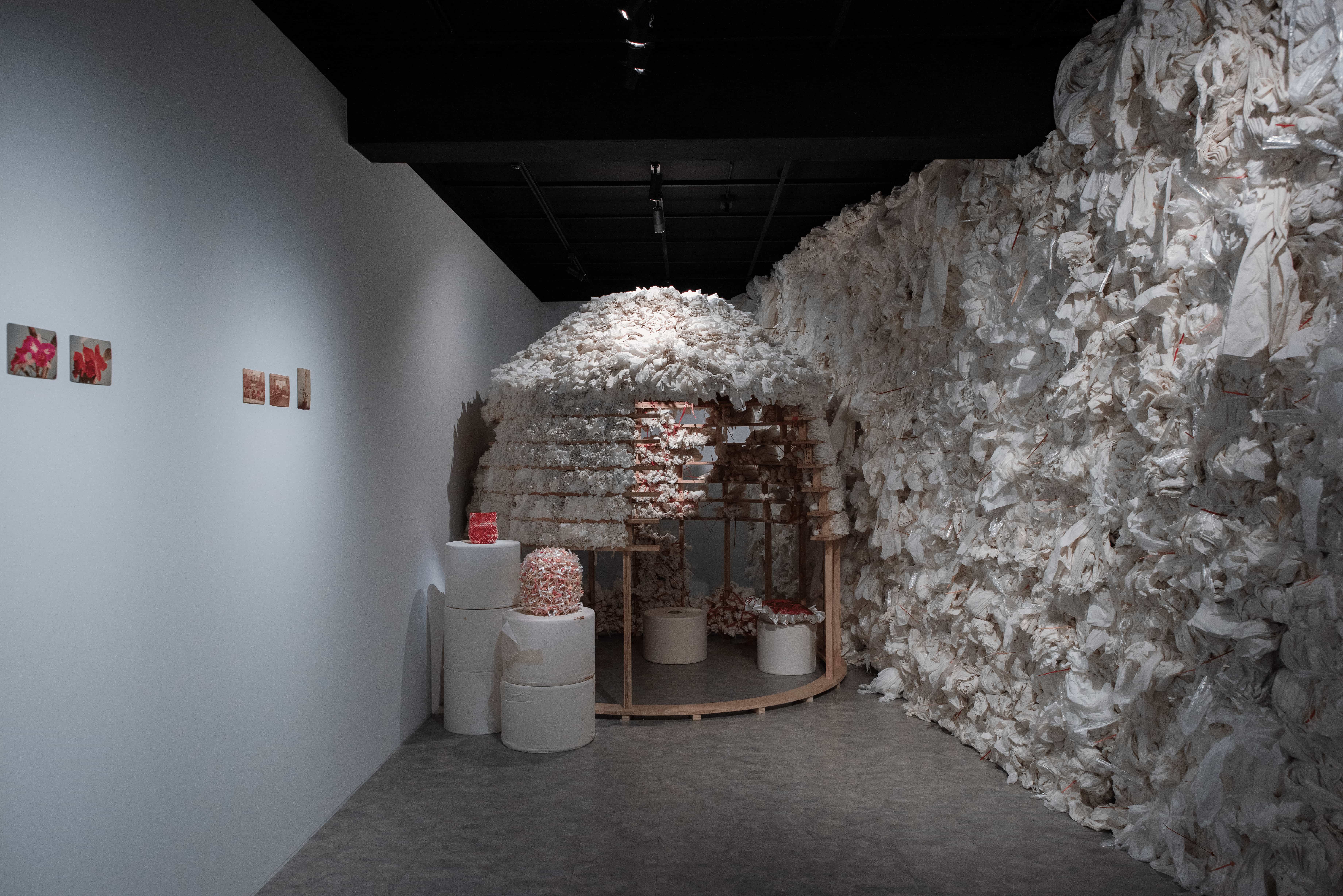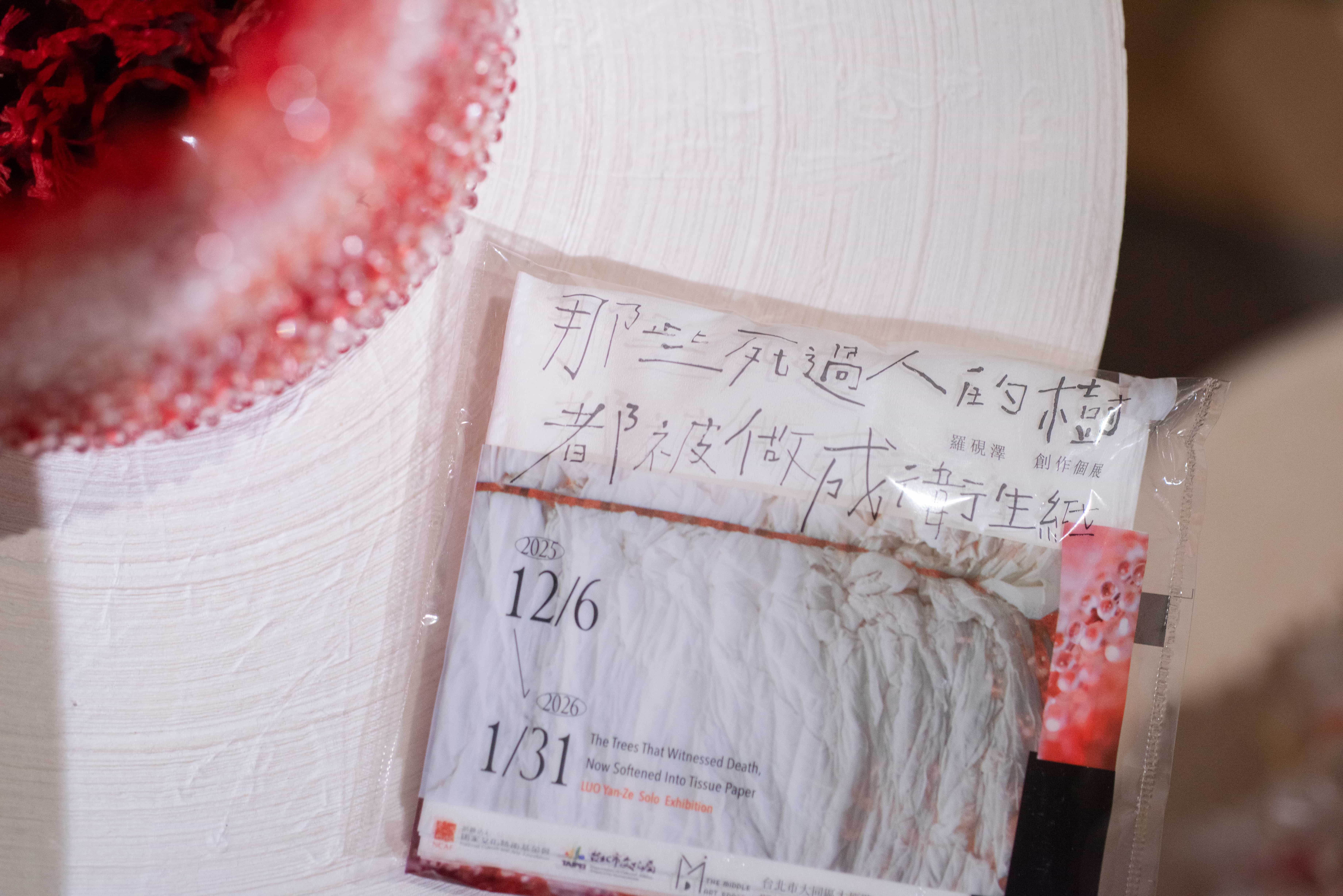 在此次展覽中,藝術家以厚實的衛生紙描摹父親與家人的風景,讓老家花園在展場中靜靜重現。那座花園既是家人爭執的場域,也是記憶彼此回望的交集。